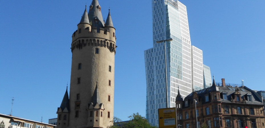 If you are downtown near the Hauptwache or Galleria Kaufhof and happen to look down the street, you will see a cool looking, medieval tower. It looks a bit out of place in the middle of town, surrounded by new buildings and traffic, but adds an historic touch of contrast to the Frankfurt city center. This is the Eschenheimer Turm (Tower). Many people think it is a reconstruction, but it isn’t. It survived the war with nary a scratch! It is nice to have something almost 600 years old, smack dab in the middle of the city. Our “Frankfurt on Foot” tours often pass by this tower and we will be happy to include a visit to this historic site on your personalized private tour.