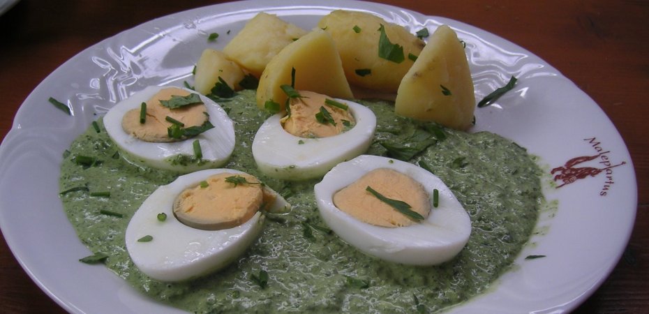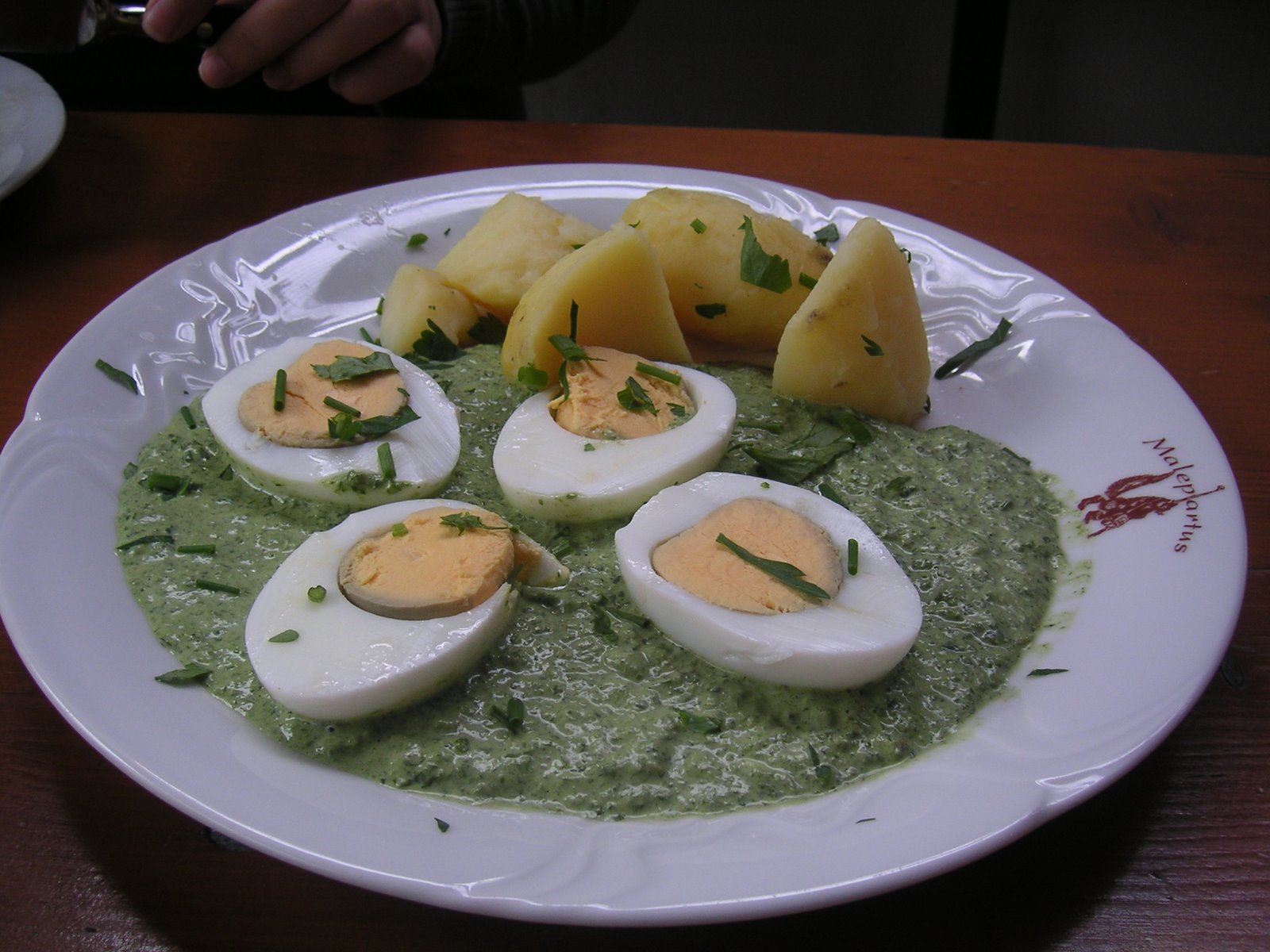 Green Sauce or Grüne Sosse, is a mixture of 7 specific herbs, chopped fine, and most often mixed with a combination of sour cream, joghurt or creme fraiche (some use mayonnaise; but not purists), a bit of oil, vinegar, and mustard, salt and pepper and then served over boiled potatoes with a couple of hard-boiled eggs. It often has chopped up eggs in the sauce itself. The best sauce is made by chopping the herbs with a knife and not with a blender or food processor as it changes the taste of it. Traditional Frankfurt restaurants may offer it with tender, boiled beef, but it can be a full meal with just the potatoes. One of the more popular menu items that you can try is a “Frankfurt Schnitzel”. This is a schnitzel topped with Green Sauce. You may also find it on a menu served with fried fish or salad.