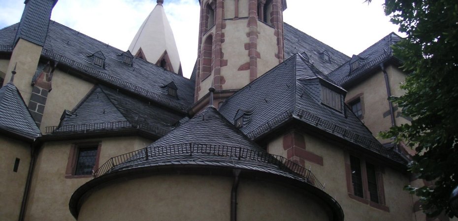 This beautiful church with its’ 2 crusader helmet towers, dates back to 1219 and contains myriad treasures. Located on the Main River, just past the Eisener Steg bridge and the Römer, it is easy to find.